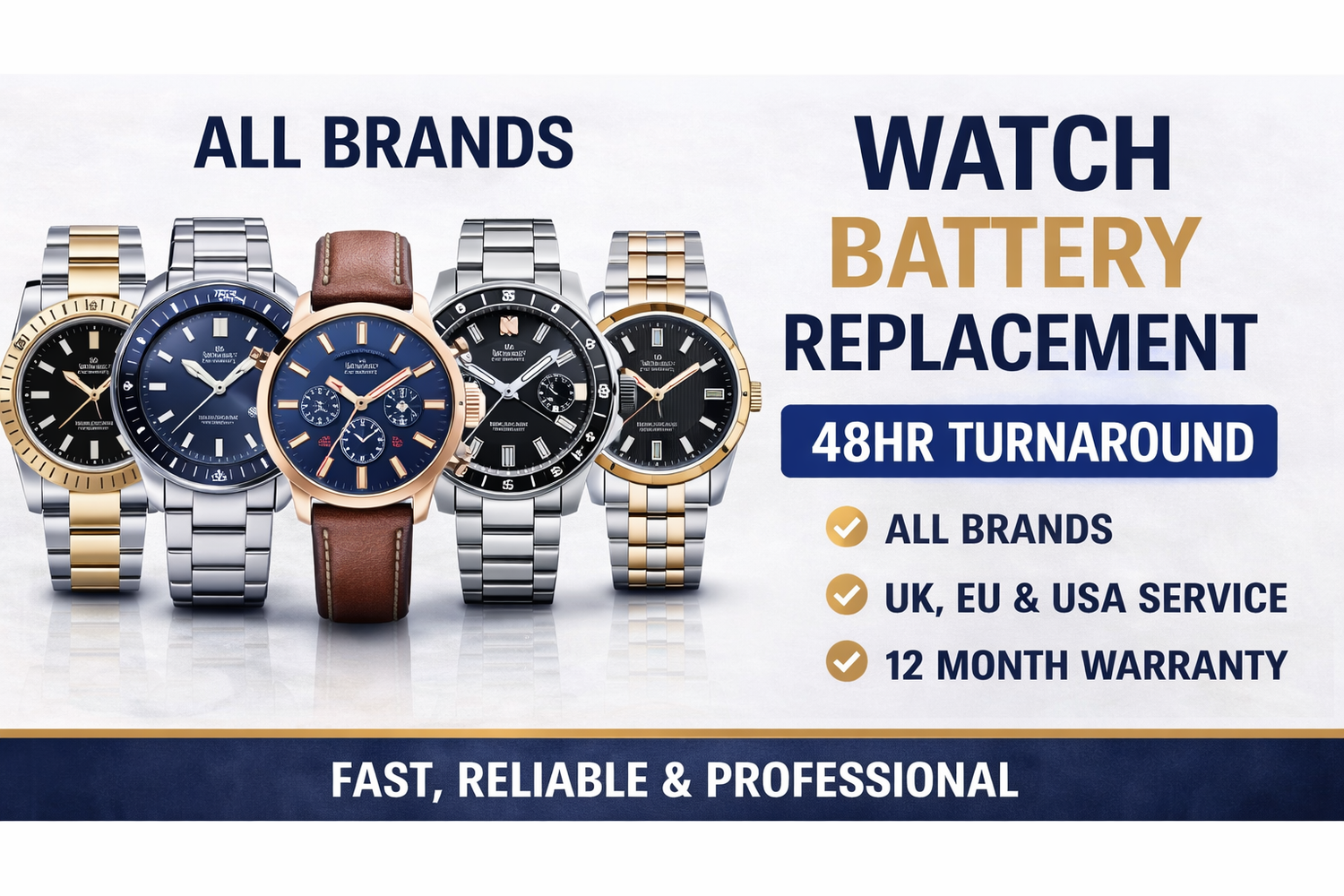 Watch battery replacement service in the UK. Fast 48hr turnaround, all brands...
